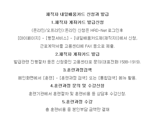 재직자 내일배움카드 발급 절차 페이지 정보 작성자 관리자 작성일16-02-19 14:50 조회7,201회 댓글0건 관련링크 이전글 다음글 목록 본문 재직자 내일배움카드 발급 절차 이전글 다음글 목록