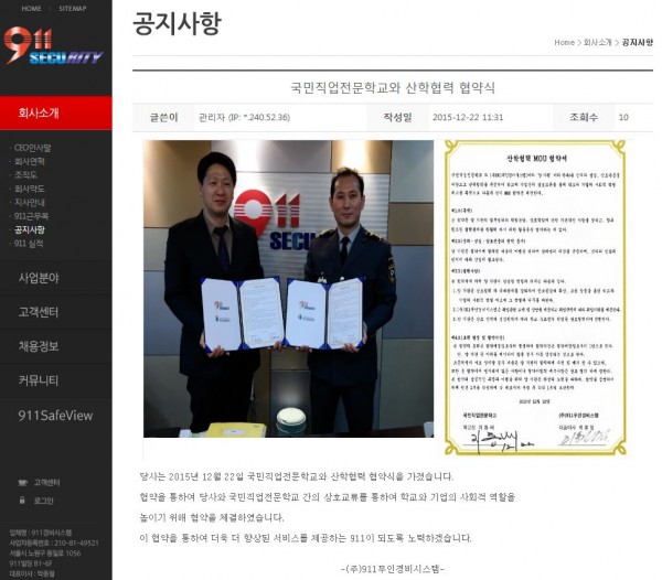(위 사진은 (주)911시큐리티 홈페이지에 게재된 MOU 내용입니다.)