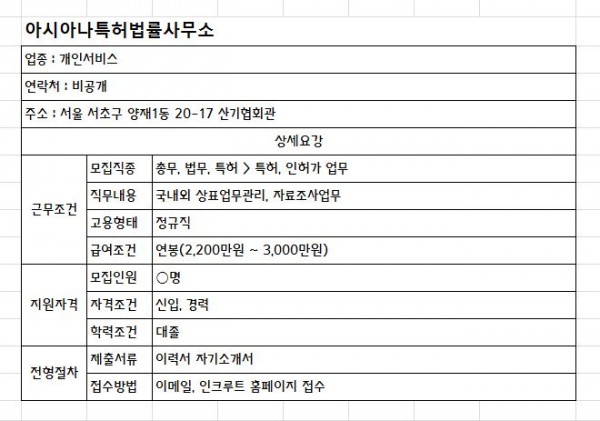 아시아나국제특허법률사무소 페이지 정보 작성자 관리자 작성일16-12-28 16:47 조회10,868회 댓글0건 관련링크 이전글 다음글 목록 본문 아시아나국제특허법률사무소에서 상표업무 관리자를 채용합니다 국내외상표업무 관리와 자료조사 업무를 담당할 사람이며 근무지는 송파구입니다. 접수마감은 2017년 1월 17일 토요일입니다. 이전글 다음글 목록