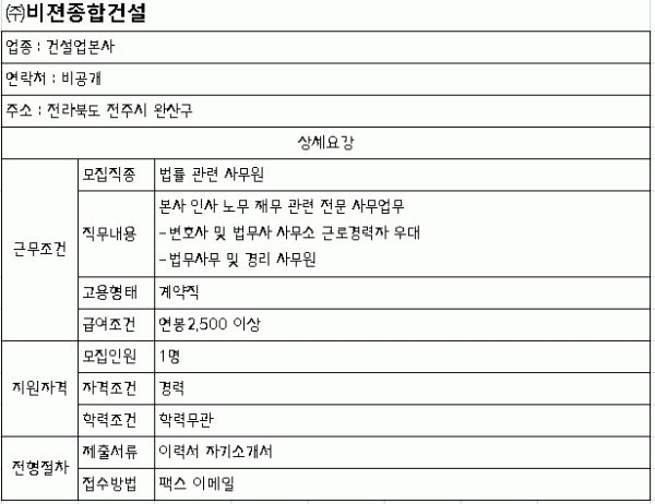 (주)비젼종합건설이 법률 관련 사무원을 모집합니다