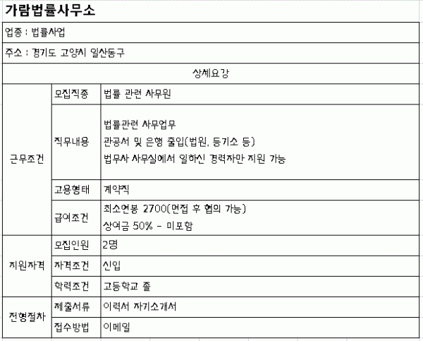 가람법률사무소 페이지 정보 작성자 관리자 작성일17-08-22 15:56 조회10,541회 댓글0건 관련링크 이전글 다음글 목록 본문 가람법률사무소에서 법률 사무원을 모집합니다 접수마감은 09월 24일 입니다 정보제공:서울일자리플러스센터 이전글 다음글 목록