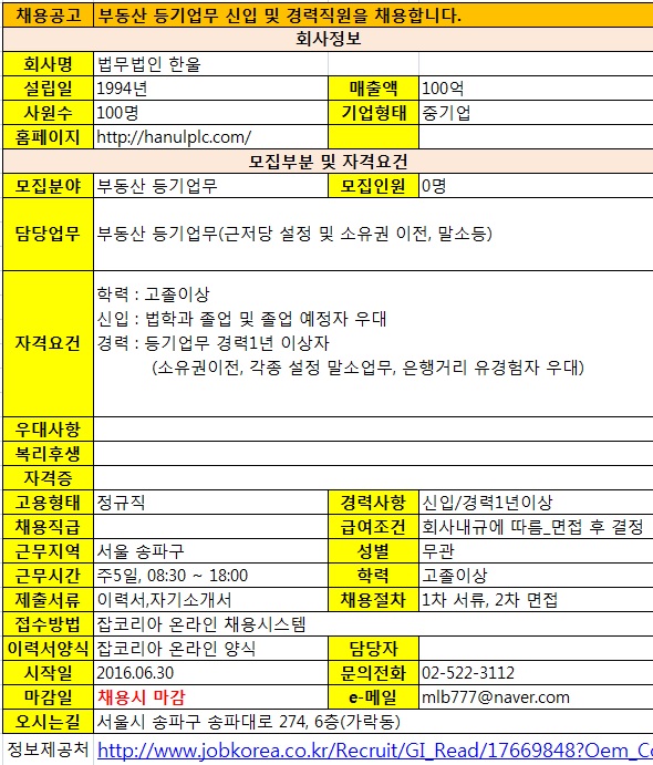 법무법인 한울 채용공고 페이지 정보 작성자 관리자 작성일16-07-07 16:53 조회9,282회 댓글0건 관련링크 이전글 다음글 목록 본문 정보제공처 잡코리아 링크 http://www.jobkorea.co.kr/Recruit/GI_Read/17581679?Oem_Code=C1 이전글 다음글 목록