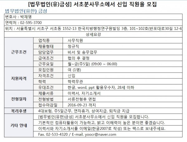 법무법인(유)금성 채용공고 페이지 정보 작성자 관리자 작성일16-09-02 15:41 조회10,960회 댓글0건 관련링크 이전글 다음글 목록 본문 법무법인(유)금성 채용공고 이전글 다음글 목록