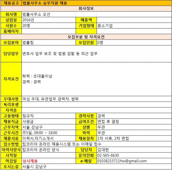 법률사무소 오션 채용정보 페이지 정보 작성자 관리자 작성일16-07-07 18:12 조회9,153회 댓글0건 관련링크 이전글 다음글 목록 본문 자료제공 잡코리아 링크 http://www.jobkorea.co.kr/Recruit/GI_Read/17112834?Oem_Code=C1 이전글 다음글 목록
