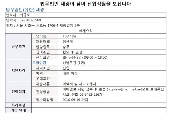 법무법인(유한)세광 채용공고 페이지 정보 작성자 관리자 작성일16-09-02 15:40 조회10,747회 댓글0건 관련링크 이전글 다음글 목록 본문 법무법인(유한)세광 채용공고 이전글 다음글 목록